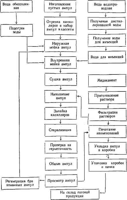 Виробництво ін'єкційних розчинів в ампулах є досить складним процесом і складається з багатьох стадій (див. схему).