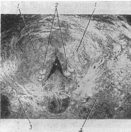 ![]() Рис. 5. Передміхурова залоза: 1 - краніальна частина; 2 - первинні елементи аденоми передміхурової залози; 3 - каудальна частина передміхурової залози. |