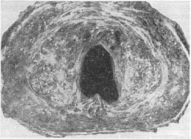 ![]() Рис. 6. Подвійне будова передміхурової залози у людини старше 70 років. Краніальна частина передміхурової залози оточує зяючий сечівник; в ній видно аденоматозні вузли. Каудальна частина передміхурової залози представляється кілька здавленої. |