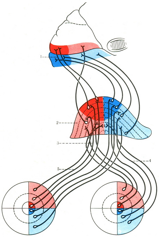 1 - зоровий кірковий центр; 2 - латеральне коленчатое тіло з ядерними шарами (1 - 7); 3 - зоровий тракт; 4 - латеральна частина зорового нерва; 5 - медіальна частина зорового нерва.