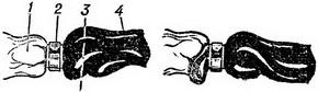 ![]() Рис. 2. Накладення скоби на пуповину. Зліва - правильне, праворуч - неправильне: 1 - шкірний край пупкового кільця; 2 - накладена скоба; 3 - лінія відсікання пуповини; 4 - пупковий канатик. |