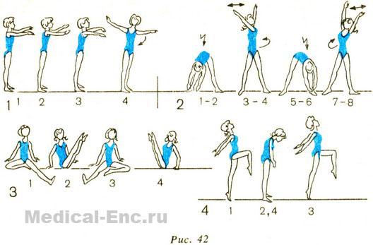 1. І. п. - стоячи, руки вперед долонями вниз. Повернути руки долонями вгору і знову долонями вниз. Поворот тулуба праворуч, руки в сторони-назад-вгору (долоні вгору, руки потягнути якомога далі назад). Те саме з поворотом тулуба ліворуч. Повторити 15 разів в кожну сторону.