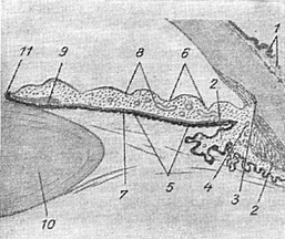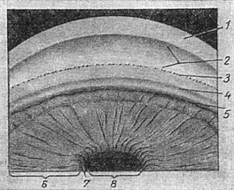 Рис. 3. Вид кореня райдужної оболонки і кута передньої камери ока при гоніоскопії. 1 - оптичний зріз рогової оболонки; 2 - задня поверхня рогової оболонки; 3 - місце прикріплення трабекул райдужної оболонки до задньої поверхні рогової оболонки (лінія Швальбе); 4 - волокна гребінцевої зв'язки з просвічує між ними шлеммовым каналом; 5 - цилиарный кран райдужної оболонки; в - передня поверхня райдужної оболонки; 7 - зрачковый край райдужної оболонки; 8 - зіниця.