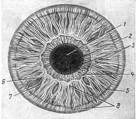 ![]() Рис. 1. Зовнішній вигляд райдужної оболонки: 1 - зіниця; 2 - пігментний обідок; 3 - зрачковый пояс; 4 - малий коло райдужної оболонки; 5 - контракционные борозенки; 6 - трабекули; 7 - крипти; 8 - цилиарный пояс.  |