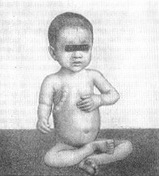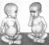![]() Рис. 3. Рахіт у близнюків 1 року 1 міс. Выстояние тім'яних і лобових горбів; деформація грудної клітки по типу курячої грудях; гаррісонова борозна; потовщення нижніх кінців передпліччя. |