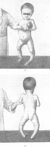 ![]() Рис. 5. Рахітичні О-подібні ноги (genu varum): 1 - спереду; 2 - ззаду. |