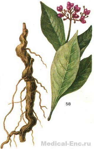![]() Рис. 58. Раувольфія зміїна (зліва - корінь).  |