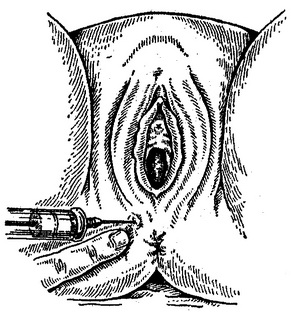 Для місцевої анестезії застосовується 0,25 або 0,5% розчин новокаїну в кількості 200-250 мл. Насамперед анестезується шкіра. У місці її проколу, тобто на 3-4 см досередини від сідничного горба, внутрішньошкірно тонкою голкою вводиться 2-3 мл новокаїну до отримання «лимонної кірки». Потім голка змінюється. Для введення новокаїну в ишиоректальную ямку потрібна голка довжиною 8-10 см і більшого калібру. Після проколу шкіри необхідно перш вводити новокаїн, а потім проводити голку глибше в тканини. Цей прийом в якійсь мірі запобігає поранення судин. В клітковину сідничо-ректального простору вводиться по 80-100 мл новокаїну з кожної сторони (рис. 22). Потім, не виймаючи голки, необхідно ввести деяку кількість новокаїну в товщу великий сороміцької губи в напрямку рани промежини.