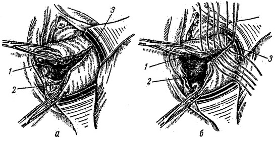 а - до накладання швів; б - в процесі накладання швів; 1 - передня губа шийки матки, 2 - задня губа шийки матки, 3 - вершина розриву.