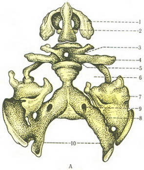 А - ембріон 7 тижнів; Б - плід 3 міс; 1 - нюхова капсула; 2 - решітчаста кістка; 3 - верхня очноямкова щілина; 4 - велике крило клиноподібної кістки; 5 - турецьке сідло; 6 - рваний отвір; 7 - слухова капсула; 8 - яремний отвір; 9 - внутрішній слуховий отвір; 10 - великий потиличний отвір.
