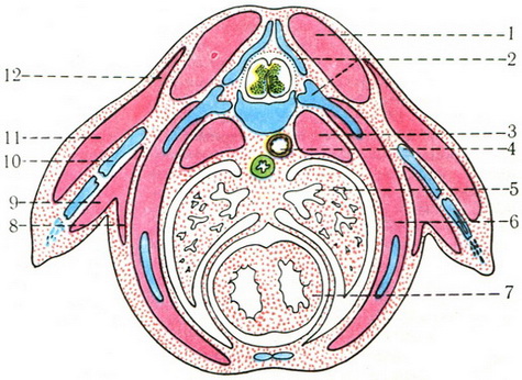1 - м'язи спини; 2 - осьовий скелет; 3 - предпозвоночные м'язи; 4 - стравохід; 5 - легеня; 6 - міжреберні і вентролатеральные м'язи тулуба; 7 - серце; 8 - призводять м'язи плеча; 9 - згинальні м'язи руки; 10 - скелет кінцівки; 11 - розгинальні м'язи руки; 12 - відвідні м'язи плеча.
