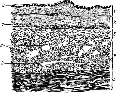 1 - амніон; 2 - хоріон; 3 - капсулярних ділянку децидуальної оболонки; 4 - ділянка істинної децидуальної оболонки; 5 - м'язовий шар матки; 5 - епітелій амніона; 7 - епітелій хоріона; 8 - судини; 9 - заліза.