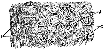 1 - волокниста мережа; 2 - зірчасті клітини; 3 - слизова речовина.