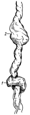 Рис. 158. Відрізок пуповини з істинним і хибним вузлом.