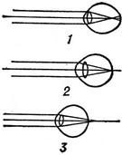 ![]() Хід променів світла при різних рефракції: 1-в близоруком оці; 2 - нормальному; 3 - в дальнозорком.  |