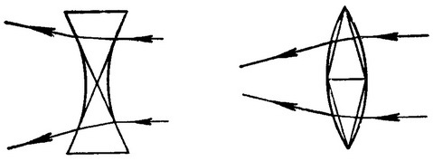 Двояковыпуклое скло можна представити як дві призми, з'єднані підставами. Промінь світла, проходячи через верхню призму, відхилиться до основи. Те ж саме відбудеться і при проходженні променя світла через нижню призму. Таким чином, це буде скло, що збирає світло,- convex. Двояковогнутое скло теж можна представити як дві призми, але сполучені вершинами. Промені світла, проходячи через них, відхиляться до основи, тобто таке скло буде розсіювати світло,- concav (рис. 31).