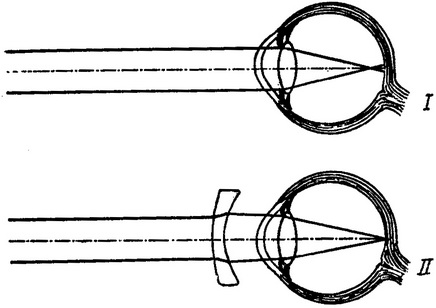I - хід променів; II - короткозорість, виправлена розсіюючим склом.