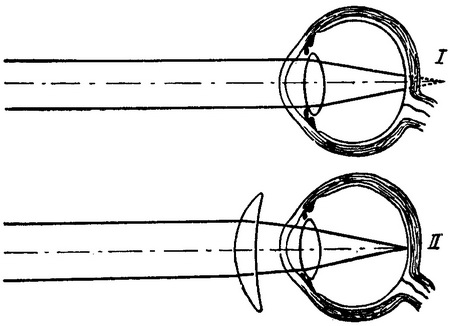 I - хід променів; II - далекозорість, виправлена збирає склом.
