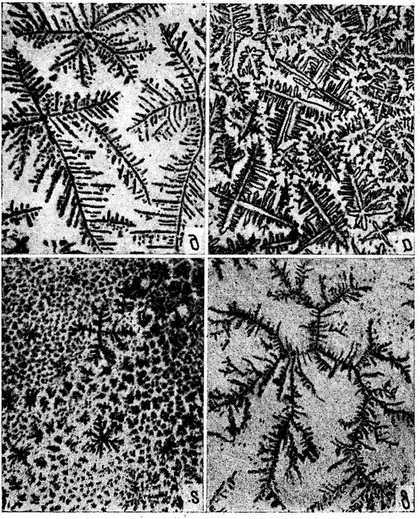 а, б, в - мазки, добре виражена кристалізація; р - відбиток, слабо виражена кристалізація (В. Т. Вартапетовой).