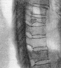 дужок хребців, їх відростків (зокрема, суглобових) може мати більше клінічне значення, ніж перелом тіла хребця. Це особливо важливо при травмі шийного відділу хребта, коли односторонній вивих в якій-небудь суглобової парі (правої або лівої) може бути переглянутий при використанні тільки шаблонної бічній проекції. При компресійних переломах хребта симптом сплощення або клиноподібної деформації тіла хребця (або тіл при множинних переломах) при відносній схоронності висоти міжхребцевої щілини є характерним. При часто зустрічаються компресійно-відривних переломах тіл хребців, крім зниження висоти тіла хребця, легко виявляються (на бічних рентгенограмах) відрив і зміщення кпереди передньо-верхнього краю (анатомічно - передньо-верхньої частини апофизарного компактного кільця з частиною губчастого шару). Травматична впровадження міжхребцевого диска в тіло хребця може бути легко переглянуто в тих випадках, коли при свіжої травми хрящ диска впроваджується в центральну частину верхньої губчастої пластинки. У результаті подібної травматичної «хрящової грижі»), які при первісному рентгенологічному дослідженні, згодом може розвинутися асептичний некроз хребця з прогресуючим сплощенням та іншими рентгенологічними ознаками (так званий травматичний спондиліт Кюммеля - Вернея). При рентгенологічному динамічному спостереженні за наслідками травми тіл хребців слід мати на увазі, що компресійні переломи тіл хребців консолідуються по эндостальному типом, а отже, без рентгенологічно виявленої освіти періостальної мозолі. Як правило, не зростаються переломи суглобових та остистих відростків. Навпаки, переломи поперечних відростків консолідуються іноді з рясним розвитком кісткової мозолі. Як правило, при переломовывихах тіл хребців зі зміщеннями утворюється добре помітна мозоль, що пояснюється кісткоутворювальної функцією поздовжніх зв'язок хребців (рис. 32 і 33).