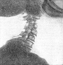 ![]() Рис. 31. То ж спостереження, що і на рис. 30. Знімок в положенні згинання вперед. Чітко видно зміщення II і III хребців. |