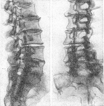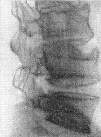 ![]() Рис. 32. Консолидировавшийся компресійно-відривний перелом III поперекового хребця (травматична передня хрящова грижа). |