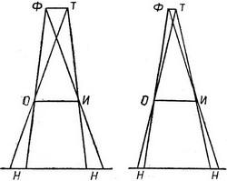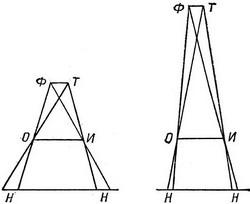 ![]() Рис. 2. Вплив фокусної відстані на різкість зображення. Позначення ті ж, що і на рис. 1. Зі збільшенням фокусної відстані нерізкість (Н) зменшується. |