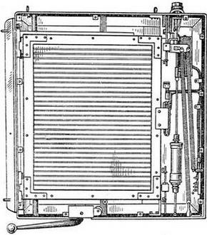 Рентгенокимограф виконаний у вигляді жорсткого каркаса, в який вмонтована многощелевая свинцева решітка, що приводиться в рух з допомогою механізму, що складається з системи пружин і масляного амортизатора.