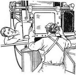 Рентгеноскопія (синонім просвічування) - один з основних методів рентгенологічного дослідження, що полягає в отриманні на просвітчастому (флюоресцирующем) екрані площинного позитивного зображення досліджуваного об'єкта. При рентгеноскопії досліджуваний перебуває просвічує між екраном і рентгенівською трубкою. На сучасних рентгенівських просвічують екранах зображення виникає в момент включення рентгенівської трубки і зникає відразу ж після її вимкнення. Рентгеноскопію зазвичай проводять в добре затемненому приміщенні рентгенівського кабінету (див.) або, в окремих випадках, біля ліжка хворого у світлому приміщенні з допомогою криптоскопа (див.). Штативи сучасних рентгенівських апаратів допускають просвічування як при горизонтальному, так і при вертикальному напрямку променів і вертикальному (рис. 1) або горизонтальному (рис. 2) положенні досліджуваного. Просвічування при горизонтальному положенні досліджуваного і горизонтальному напрямку променів називається латероскопией. Просвічування при горизонтальному положенні досліджуваного і вертикальному напрямку променів називається трохоскопией(див.). Через невеликий яскравості зображення рентгеноскопія вимагає попередньої адаптації очей до темряви. Щоб уникнути втрати адаптації не слід у перервах між просвечиваниями включати в кабінеті яскраве освітлення.