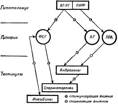 Регулювання роботи системи гіпоталамус-гіпофіз-тестікули здійснюється також за принципом кільцевої замкнутої системи (рис. 4).