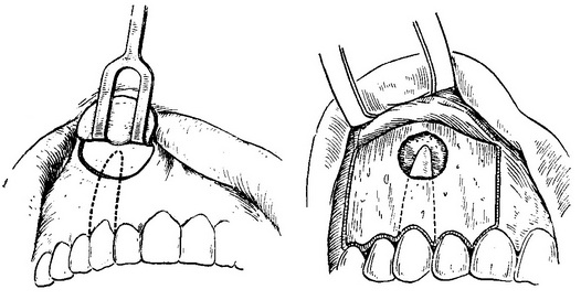 Після того як хворий відповідним чином підготовлений до операції, тупими гачками відтягують губу або щоку і приступають до анестезії. При резекції верхівки кореня на верхній щелепі, рекомендуються провідникове знеболювання у підочноямкового отвору або бугра верхньої щелепи в поєднанні з інфільтраційної анестезією для знекровлення операційного поля. У деяких випадках достатньо знеболювання зубного нервового сплетення. Для проведення резекції верхівки кореня на нижній щелепі слід користуватися мандибулярной анестезією в комбінації з інфільтраційної. З метою освіти слизисто-надкостнічного клаптя запропоновано кілька видів розрізів. Найбільш уживаним і зручним є дугоподібний розріз по Парчу (рис. 36).