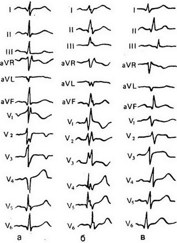 Спортсмен Л., 40 років, розряд з марафонського бігу. Скарг не пред'являє, здоровий. На ЕКГ почали з'являтися зміни, що свідчать про дистрофії міокарда внаслідок фізичного перенапруження,- негативний Т у відведеннях V1 і V2, двофазність у V3 (рис. 8, а). Незважаючи на заборону лікаря продовжував тренуватися. Через місяць на ЕКГ з'явилась повна блокада правої гілки (рис. 8,6); при повному припиненні тренувань блокада зникла (рис. 8, в).