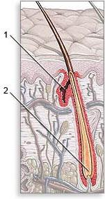 ![]() 1 - сальна залоза; 2 - волосяний фолікул |