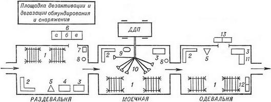 Принципова схема розгортання відділення спеціальної обробки ППГ: 1 - стійка з ношами; 2 - лава для сидячих уражених; 3 - стіл для медикаментів; 4 - стіл для захисних пов'язок; 5 - умивальник; - тара для заражених предметів (а - верхнього одягу, б - білизни, взуття); 7 - ящик для документів: 8 - таз з дезінфікуючими або дегазирующими розчинами; 9 - ємність для миючих препаратів, 10 - переносні душові сітки; 11 - стіл для перев'язувальних матеріалів; 12 - тара для білизни (з обмінного фонду); 13 - тара для використаних захисних пов'язок. Стрілкою вказано напрямок руху уражених.