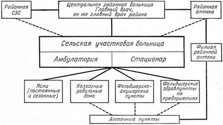 Всі медичні установи сільських лікарських дільниць організаційно об'єднані і працюють за єдиним комплексним планом під керівництвом завідувача ділянкою - головного лікаря сільської дільничної лікарні або амбулаторії (рис.).