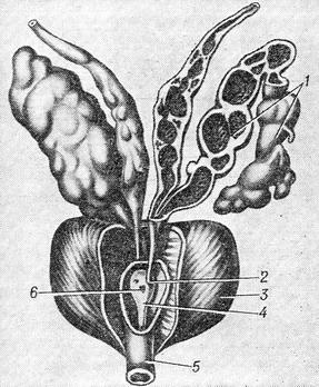 ![]() Топографія насіннєвого горбка: 1 - сім'яні пухирці (справа в розрізі); 2 - семяизвергающий протока; 3 - передміхурова залоза; 4 - насіннєвий горбок; 5-сечовипускальний канал; 6 - передміхурова маточка. |