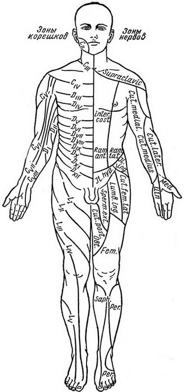 Схема розподілу шкірної чутливості відповідно нервів і корінців.