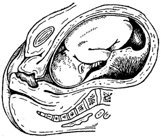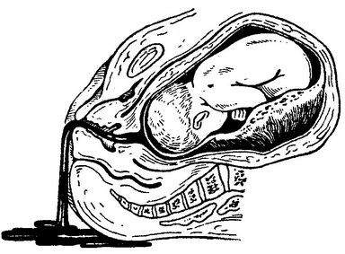 Рис. 62. Передчасне відшарування нормально розташованої плаценти. Відшарування краю плаценти. Зовнішня кровотеча.