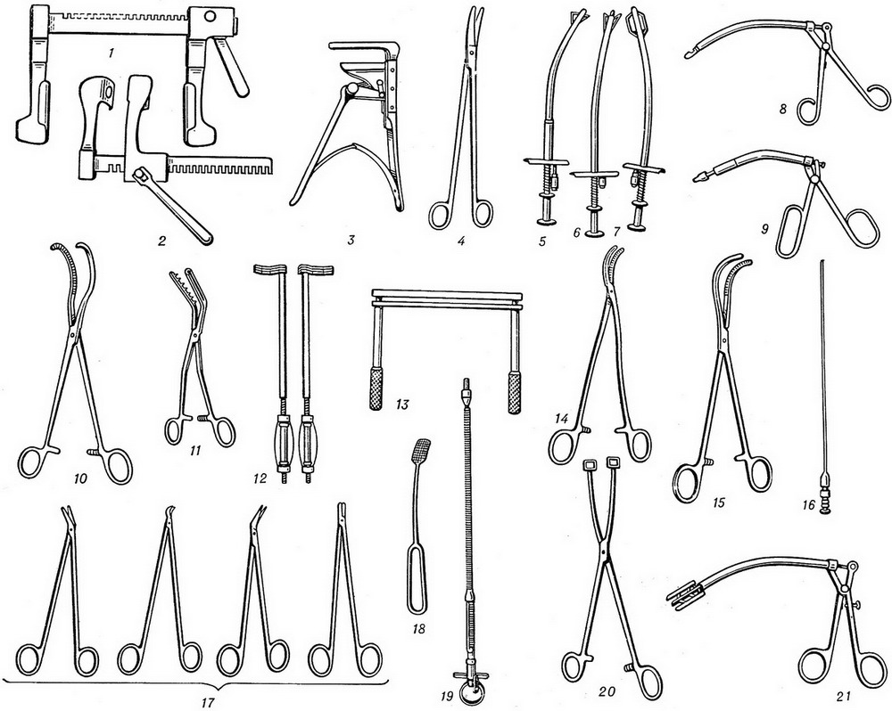 Рис. 4. Інструменти для операції на серці та магістральних судинах: 1 і 2-ранорасширители для грудної порожнини (1 велика, 2 - середній); 3 - стернотом; 4 - ножиці тупокінцеві вигнуті; 5-7 - вальвулотомы (5 - з ромбовидними ножами, 6 - з пелюстковими ножами, 7 - з двома паралельними ножами); 8 і 9 - викусувачі (8 - полуциркулярный, 9 - циркулярний); 10-затиск для вушка серця; 11-затиск голчастий для ран і аневризм серця; 12 - затискачі для часткового бічного притиснення судин (правий і лівий); 13 - затиск рамковий для аневризм аорти та серця; 14 та 15 - затискачі-диссекторы судинні (14-вигнуті, 15 - з прямою ручкою); 16 - голка для пункції серця; 17 - ножиці судинні (зліва направо - криві, зігнуті по площині, зігнуті по ребру, прямі); 18 - скарифікатор; 19 - турнікет гнучкий; 20 - щипці для захоплення вушка серця; 21 - розширювач двох-планочний.