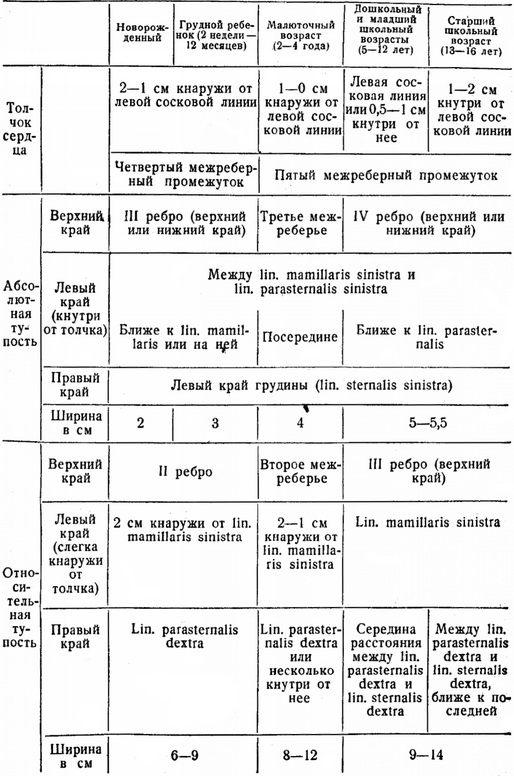Для правильної оцінки отриманих перкуторний даних треба знати вікові особливості кордонів дитячого серця і ті умови, при яких ці межі можуть дещо змінюватися навіть у абсолютно здорових дітей. З табл. 14 рис. 76 видно, що перкуторно межі абсолютної та відносної тупості у дітей з віком щодо зменшуються. Звичайно, при визначенні перкуторний меж серця у дітей не слід обмежуватися тільки крайніми точками - верхній, лівою і правою, а треба постаратися визначити всю конфігурацію серця, визначаючи по межреберью відстань правої і лівої меж від передньої середньої лінії.