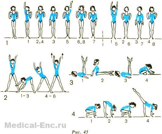 1. І. п. - стоячи, руки до плечей, кисті стиснуті в кулак. Підняти праву руку вгору, як можна сильніше витягаючи долоню і пальці. Знову зігнути руку до плеча, кисть стиснути в кулак. Опустити праву руку вниз, долоня та пальці максимально витягнуті. Повернутися в і. ft. Те ж лівою рукою, потім обома руками разом. Повторити 16 разів.