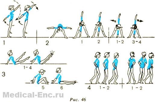 2. І. п. - стоячи, ноги нарізно. Повільно нахилитися вперед і розвести руки в сторони. Повернути тулуб і голову наліво, пальці правої руки торкаються підлоги, ліва рука піднята вгору (подивитися на руку). Те ж в іншу сторону. То ж з пружним рухом при повороті тулуба і дотиком підлоги всією долонею. Виконувати 4 рази не пружинячи, 2 рази з пружним поворотом. Повторити 14 разів.