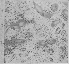 ![]() Рис. 10. Парапротеинемічний нефроз при мієломної хвороби: склероз і круглоклеточная інфільтрація (1) интерстиция нирки; просвіти канальців розтягнуті, заповнені білковими масами (2), епітелій атрофичен; 3 - регенерація епітелію звивистих канальців.  |