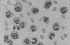 ![]() Рис. 11. Лейкемічного миеломатоз («плазмоклеточная лейкемія»). Велика кількість плазмомиеломных клітин (1) у периферичній крові.  |