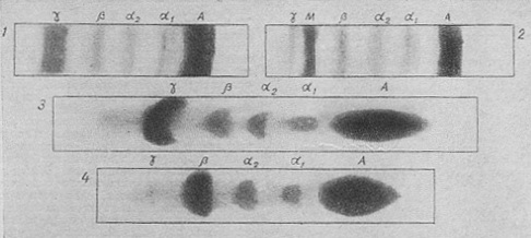 Рис. 9. Электрофореграммы сироватки здорової людини та хворих мієломної хворобою: 1 - нормальна электрофореграмма; 2 - мієлома з быстродвижущейся патологічної гамма-глобулінової фракції («М»), що розташовується між β і ү; 3 - «ү-мієлома»; 4 - «β-мієлома».