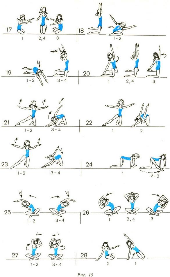 24. І. п. - стоячи на колінах, пальці рук дотикаються. Праву ногу випрямити і ковзати носком ноги по підлозі до правій руці, голова слід за рухом ноги. Повернутися в в. п. Те ж в іншу сторону.