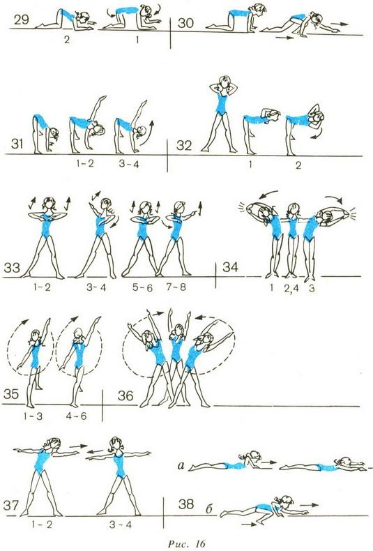 33. І. п. - стоячи, ноги нарізно, руки зігнуті перед грудьми (плечі розгорнуті й опущені, лікті вище кистей). Виконати два пружні рухи руками назад, повернути тулуб праворуч, відвести праву руку в сторону-вгору-назад (долоню вгору) і зробити два маха тому. Повернутися в в. п. Те ж в іншу сторону.