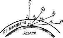 ![]() Рис. 2. Залежність між висотою стояння сонця та довжиною шляху, прохідного сонячними променями в атмосфері. S1 - сонце в зеніті; S4 - сонце на горизонті |