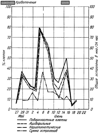 Підвищення показника сумарних естрогенів 4 - 6/VI 1964 р. до 36 мкг на добу, що виразилося в пропорційному збільшенні показника всіх трьох фракцій цих гормонів (естріолу до 20 мкг, естрону до 3,4 мкг, естрадіолу до 12,6 мкг), супроводжувалося збільшенням кількості ацидофільних клітин до 77%, кариопикнотических - до 78%, поверхневих - до 78%. Криві кольпоцитологических показників за своїм зовнішнім виглядом дуже нагадують криву екскреції сумарних естрогенів.
