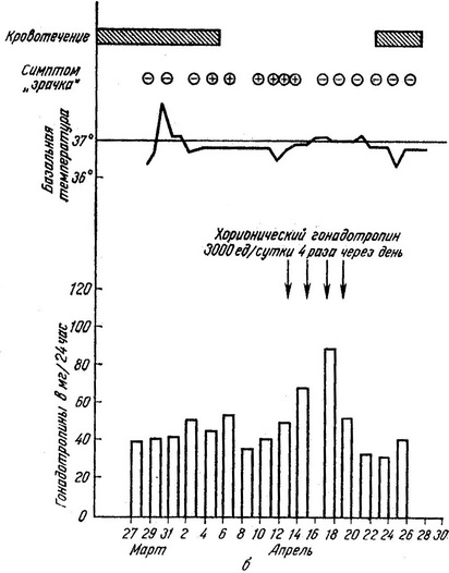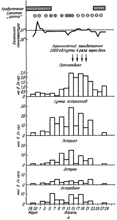 Як видно з рис. 19 до лікування хворий репродуктивного віку хоріонічним гонадотропіном рівень екскреції загальних естрогенів був низьким. Овуляционный і лютеиновый піки, що характеризують двофазний менструальний цикл, були відсутні. Під час введення хориогонина (по 3000 одиниць через день, всього 4 рази) екскреція естрогенів залишалася без істотних змін. Кількість виділеного прегнандіолу до застосування хоріонічного гонадотропіну було невеликим, але введення хоріонічного гонадотропіну призвело до значного збільшення екскреції прегнандіолу. Після першої ж ін'єкції препарату вона зросла до 2,515 мг на добу і виявився виразний пік виділення прегнандіолу, що нагадує лютеиновый максимум при нормальному менструальному циклі. Виділення гонадотропінів з сечею до початку введення хоріонічного гонадотропіну було монотонним і коливалося в межах величин, характерних для нормального менструального циклу поза піків. Циклічних піків, що нагадують гонадотропні максимуми в нормальному циклі, не виявлено.